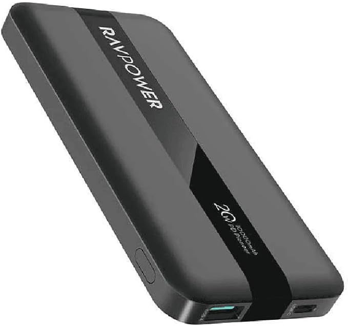 Ravpower 10000mAh 20W 2 Ports Power Bank compatible with a wide range of devices including Galaxy S21, S21 Ultra, iPhone, iPad, LG G8, G7, V60, V50 and more. Dual outputs and PD outlet allow charging up to 2 devices simultaneously. Fully recharge the power bank 20 minutes faster than standard large-capacity chargers in only 5.75hrs. Every LED displays 25 percent of the battery capacity and flashing during the charging.